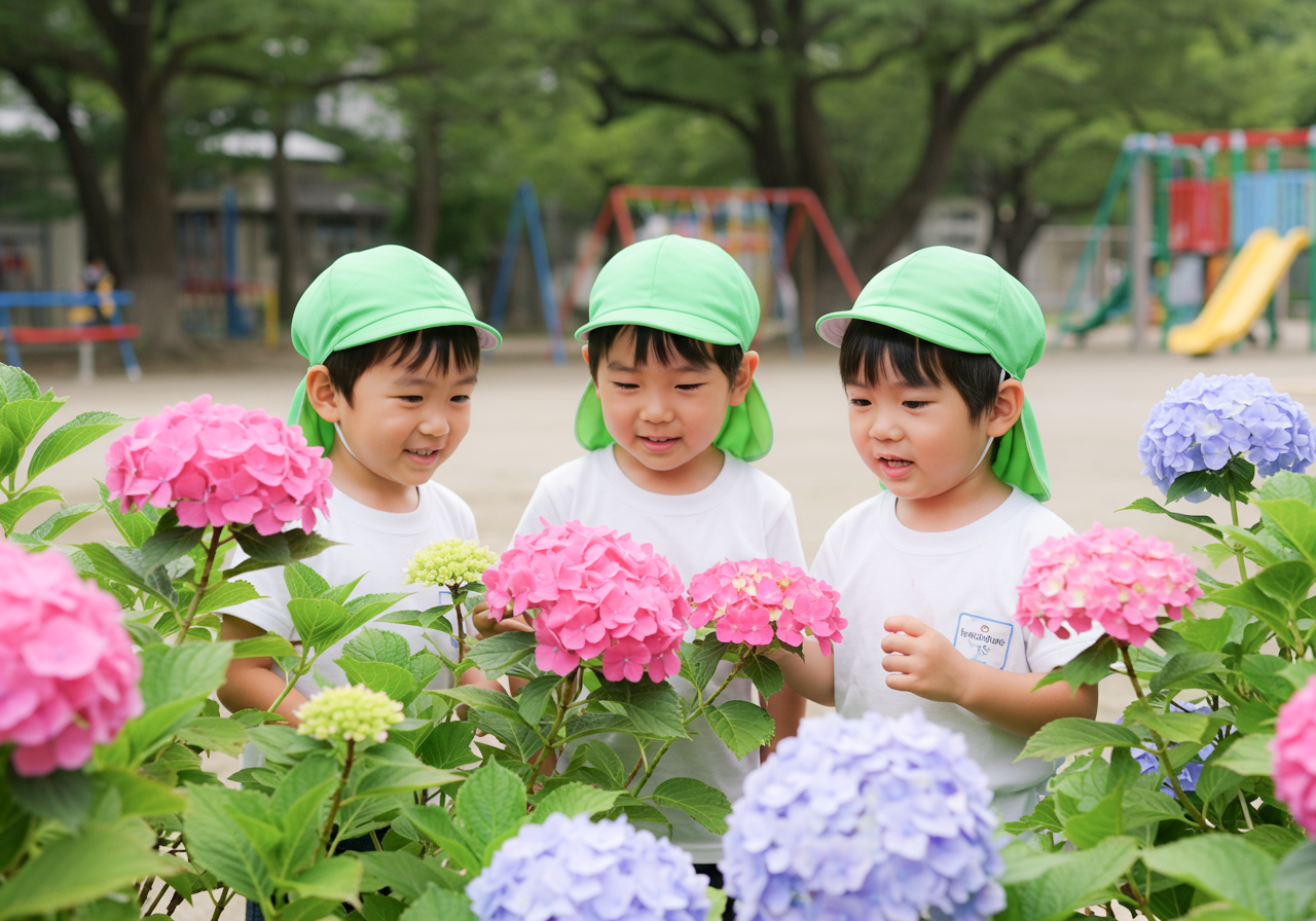 梅雨の季節になり、園庭のあじさいがきれいな色を見せてくれています。青やむらさき、ピンクなど、さまざまな色の花が咲き誇り、毎日少しずつ変化する様子が楽しめます。子どもたちも登園するとすぐにあじさいのところへ向かい、「むらさき!」「ピンクもあるよ!」と目を輝かせながら観察しています。花びらの数を数えたり、雨粒にぬれる花の様子を見たりと、自然に触れる貴重な時間となっています。これからも季節の移り変わりを五感で感じながら、豊かな感性を育んでいきたいと思います。